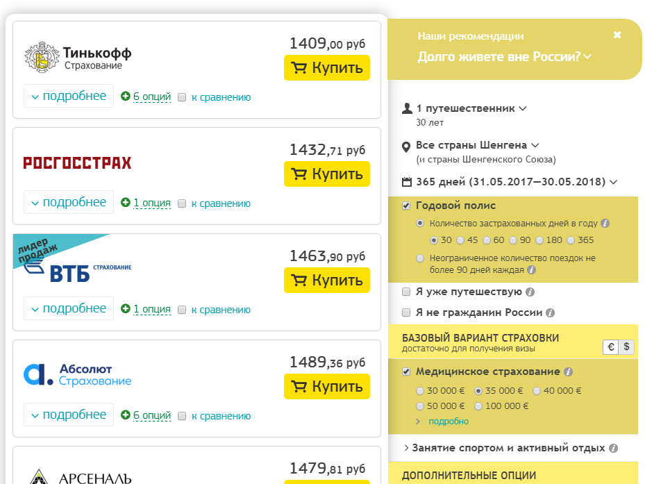 Советуем обратить внимание на рекомендации сервиса – после введения всех условий на черепаха предложит лучшие варианты для страны, в которой вы уже находитесь или собираетесь посетить. Если нажать кнопку «Подробнее» возле логотипа страховой компании, появятся доступные варианты, если есть необходимость можно выбрать дополнительные опции и задействовать фильтр