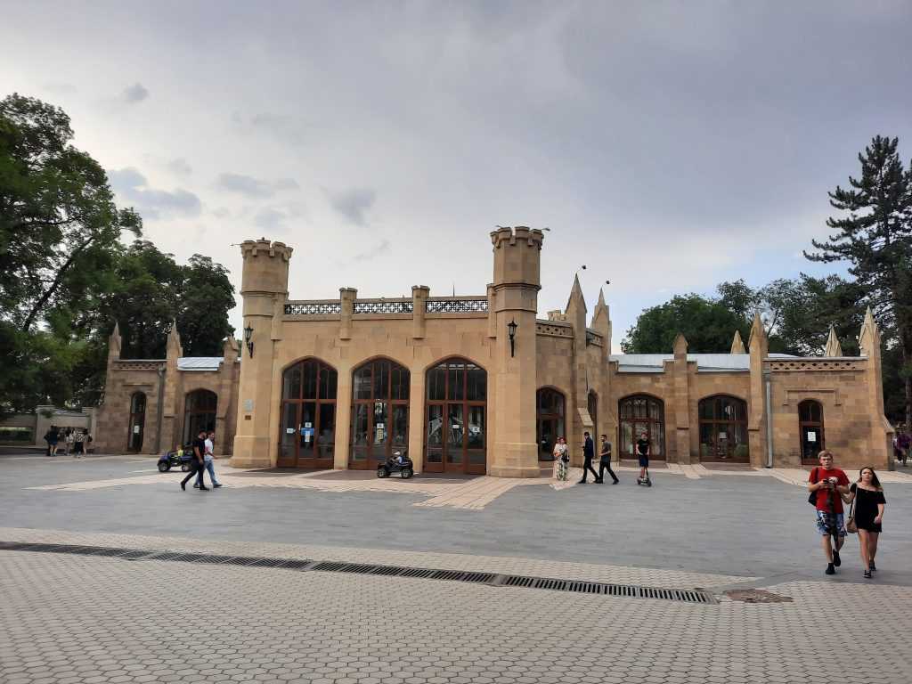 Нарзанная галерея — необычное архитектурное сооружение в европейском стиле было построено английским архитектором на месте старинного горского колодца. Оно украшено изящными готическими башенками и больше смахивает на средневековый замок. Что очень символично, если посмотреть на эту постройку с высоты, то она предстанет в форме ключа от замочной скважины. Здание чем — то напомнило мне Воронцовский дворец в Крыму, возможно потому что у обоих был один граф — меценат, любитель средневекового английского стиля.