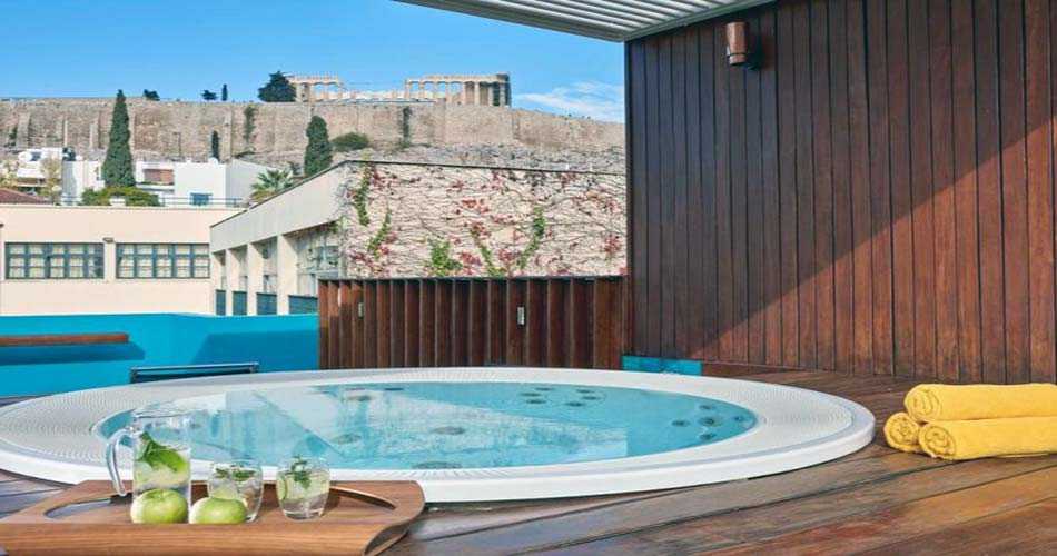 Un hôtel ultra-luxe avec un restaurant/bar/piscine sur le toit avec la meilleure vue d’Athènes. Gamme complète de services de spa.