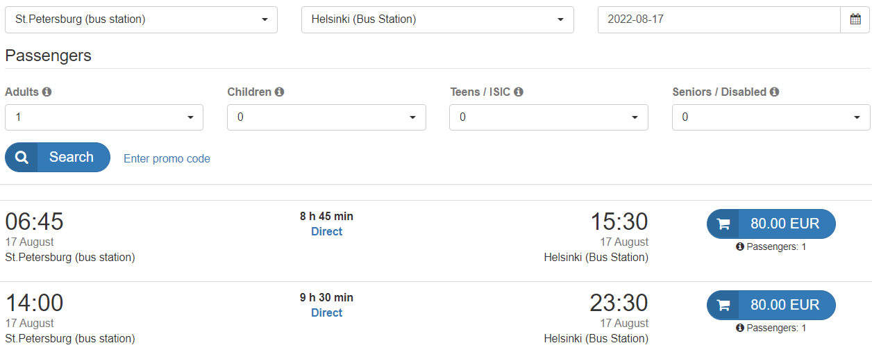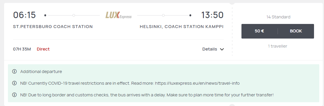 С 8 июля 2022 года между Петербургом и Хельсинки запускают дополнительные рейсы автобусного сообщения. Lux Express будет ходить все лето ежедневно, с отправлением из СПб в 06:15, 11:00 и 15:00. Из Хельсинки автобусы выезжают в 08:30 и в 16:15, с 8 по 31 августа дополнительно добавят рейс в 23:50 в дни с четверга по воскресенье.