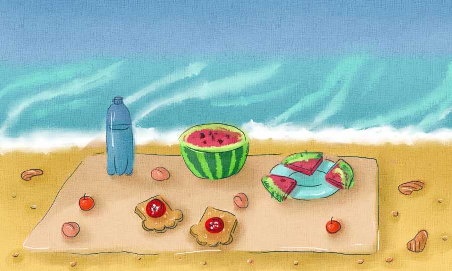 Обязательно возьмите достаточное количество воды. В жару ребенка стоит регулярно поить, чтобы избежать обезвоживания. Подойдет негазированная вода или сок. Каши, молочные продукты и другую скоропортящуюся еду берите с собой только в сумке-холодильнике и старайтесь съесть в первые два часа после прихода на пляж.
