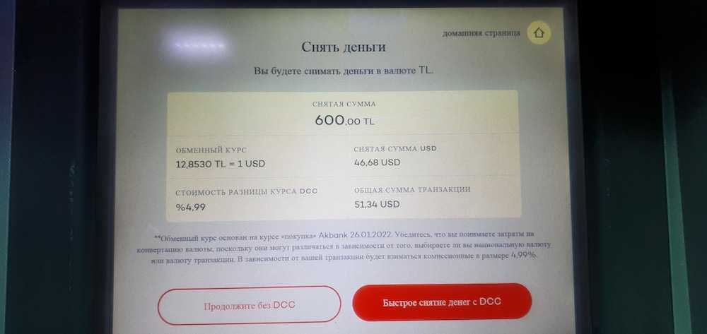 Большинство банкоматов имеет меню на русском языке. Иногда нужно выбрать язык, а иногда он автоматические определяется после приема карты. Процесс снятия наличных стандартный, но есть нюанс: после выбора суммы в лирах все банкоматы предлагают сконвертировать лиру по курсу банка — всегда отказывайтесь от этой опции. Выскакивает подобное окно:
