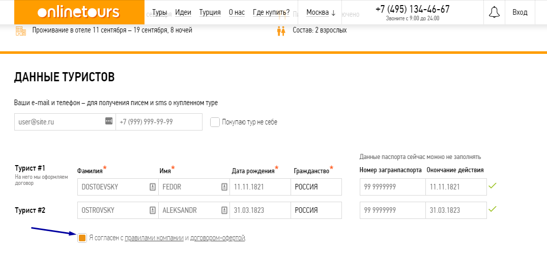 Заполняем данные туристов. Не забываем отметить согласие с правилами компании и договором-офертой.