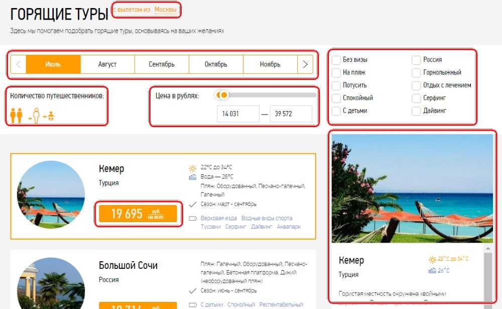 Сервис Онлайн Турс Ру секунду подумает и покажет вам все подходящие варианты горящих туров и акций. Нажимайте на понравившиеся варианты, а в столбце справа будет открываться подробное описание.