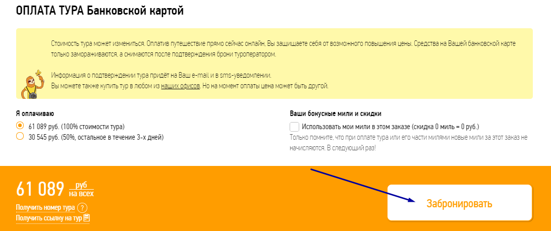 Осталось внести оплату и тур ваш! Обратите внимание! Вы можете оплатить 50% стоимости тура, а оставшуюся часть суммы – в течение трех дней
