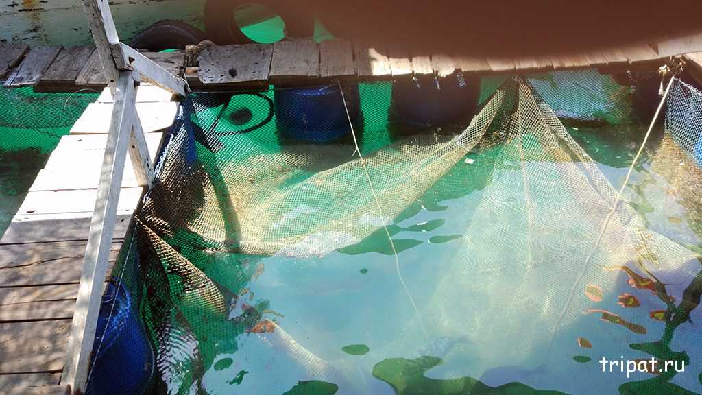 Нас подвезли к такому вот деревянному помосту. Первое что нам показали, были большие квадратные бассейны. Бассейны сделаны также из бочек и рыбацкой сетки натянутой по всему периметру. Таких вот мини аквариумов было несколько штук и в каждом из них плавали рыбы, скаты. В парочке были даже морские звезды и ежи. Здесь таким образом разводят и выращивают различные морепродукты. Но на самом деле, уже давно, основной бизнес здесь — туризм.