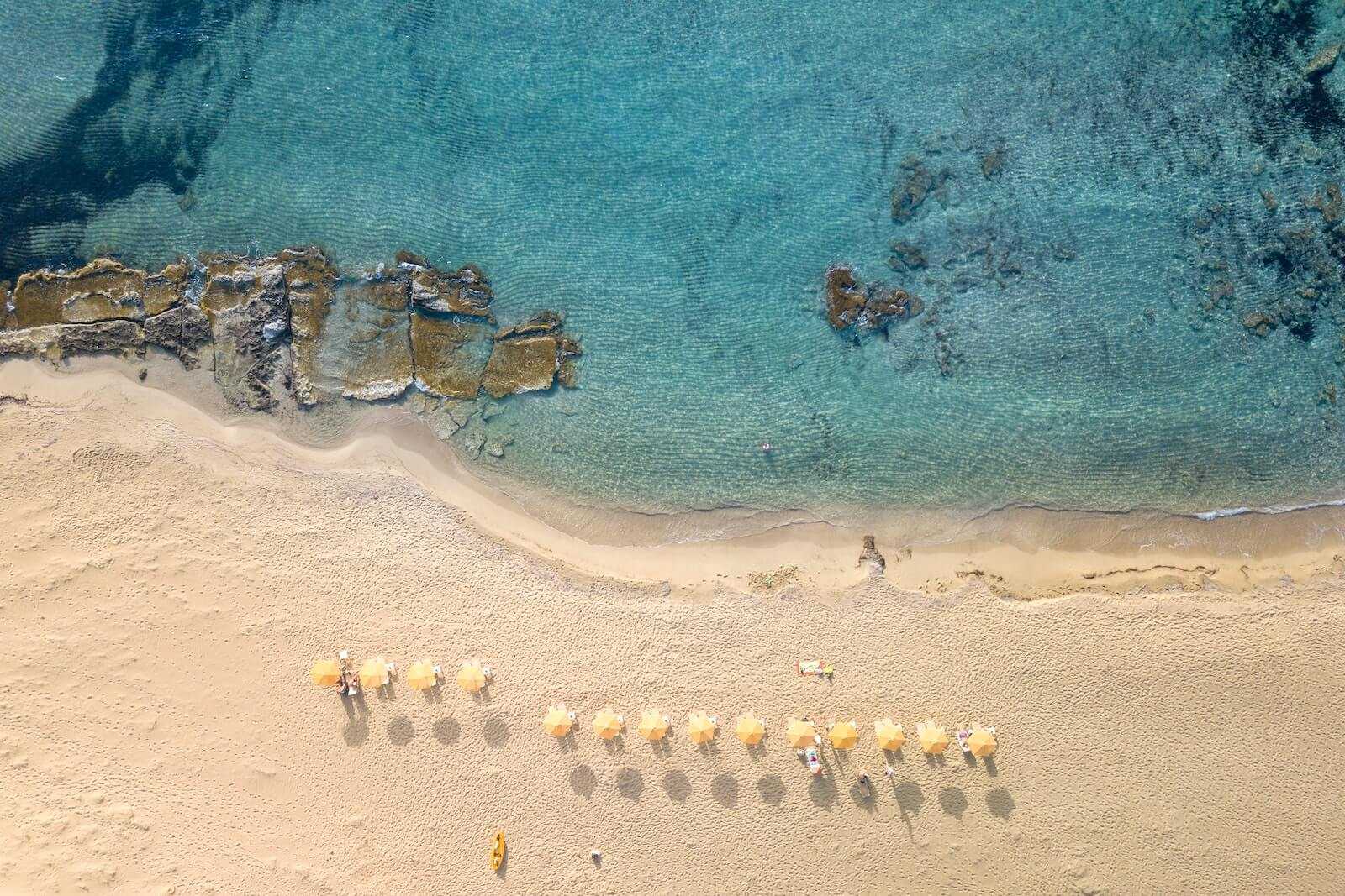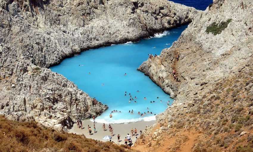 Здесь сливаются воды Ионического, Эгейского и Ливийского моря. Побережье покрыто ослепительно белым песком, розовыми ракушками и россыпью разноцветных камней. Бирюзовые спокойные мелководные лагуны безопасны для купания детей.