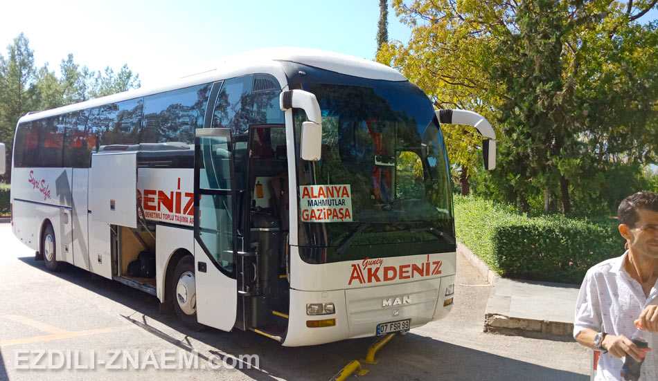 Автобусы из Анталии в Аланию следуют каждый час, время в пути 2.5 – 3 часов. Билеты можно купить в кассе компании “Akdeniz”, стоимость 35 лир.
