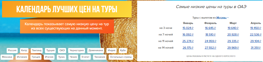 Например, у Левел Тревел есть Календарь низких цен. Это цены, которые были найдены при последнем поиске клиентом. Календарь обновляется онлайн, автоматически, как только обнаружится новая цена.