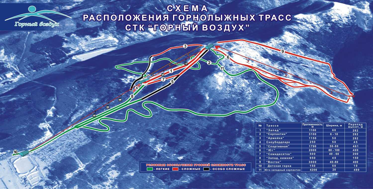 - 5 «зеленых» трасс, по 10 «синих» и «красных».